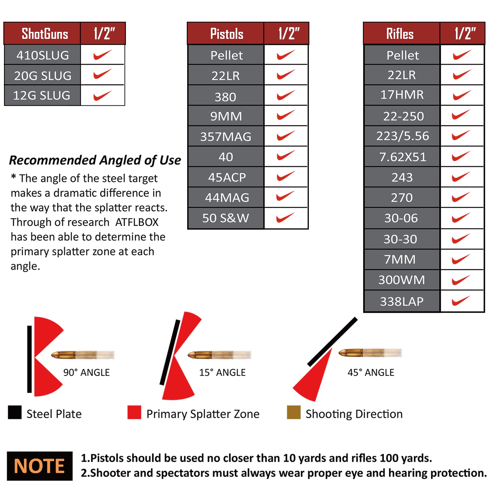 - Various Compatibility: This 1/2 inch AR500 target set is qualified for different training and shootings. It can easily withstand rifle calibers up to 338LAP and most handgun and shotgun rounds. Pistols should be used no closer than 10 yards and rifles 100 yards.