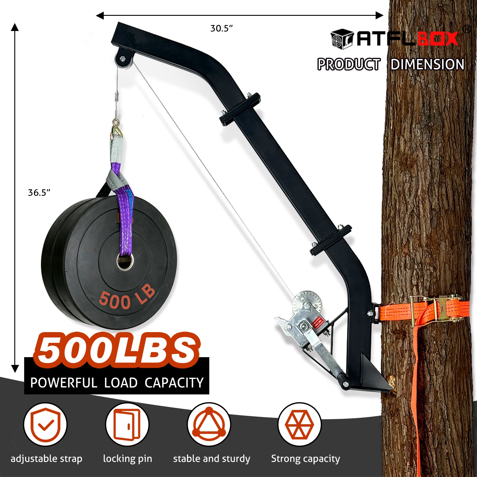 ATFLBOX Tree Mounted Game Hoist for Hunting with Winch and Ratchet Strap, 500LBS Capacity Hunting Deer Hanger, 26FT Steel Cable Heavy Duty Deer Hoist for Skinning, Hanging Deer Feeder Hoist