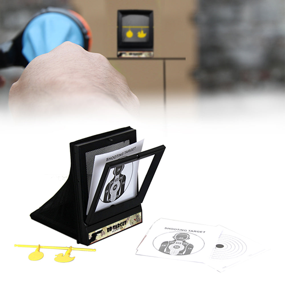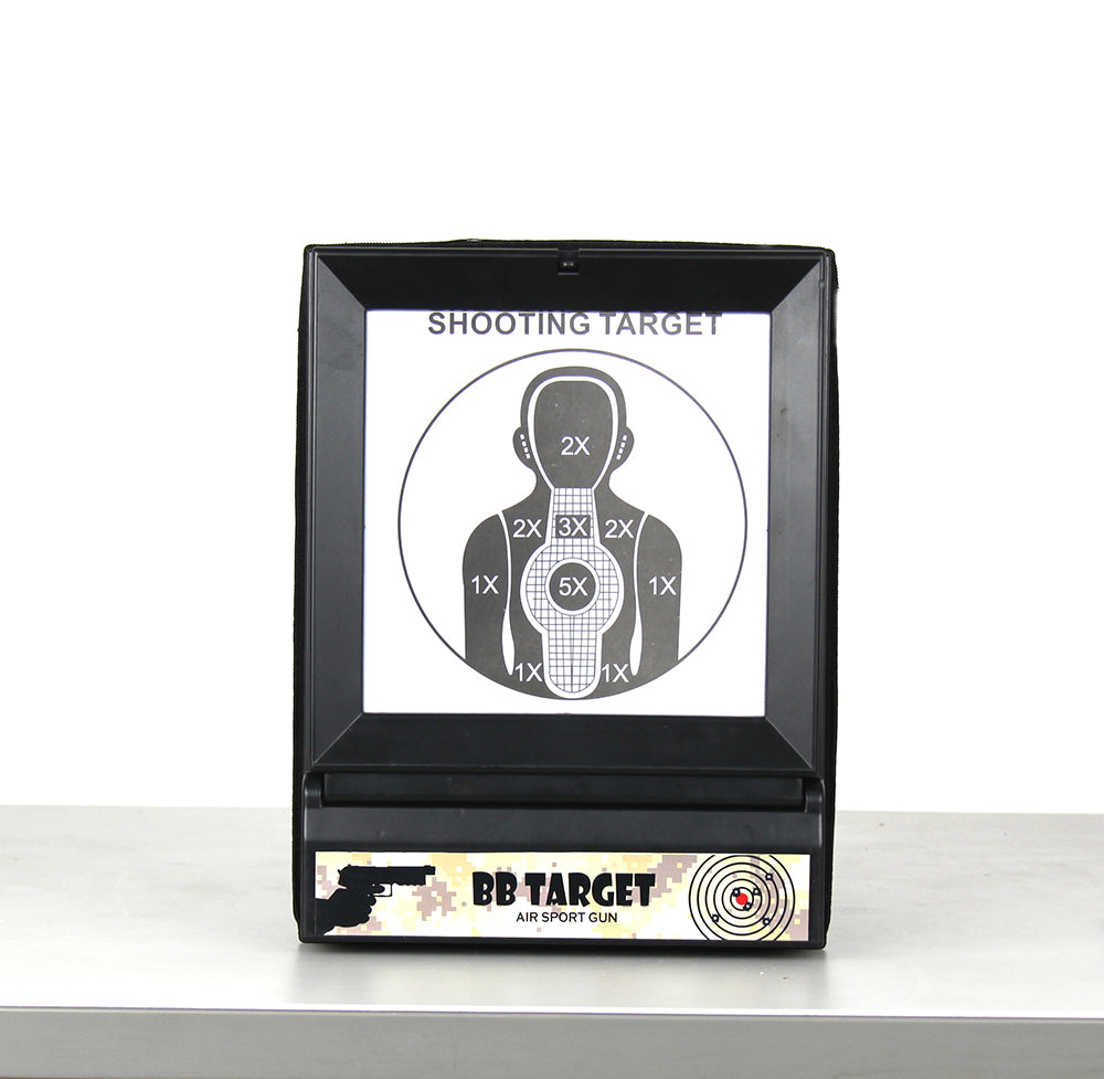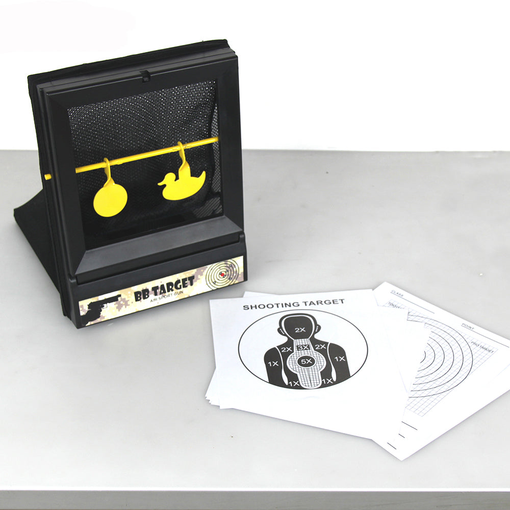 - Package includes 1x airsoft targets with net catch & paper targets for shooting range. 50 x paper targets included. Material: BB gun targets for shooting outdoors are made of high-quality plastic. Size: It is about 7"x10" in length and width.