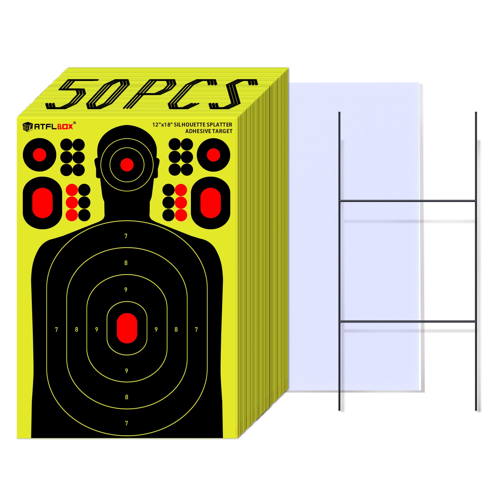 ATFLBOX 50PACK 12x18 inch Silhouette Splatter Targets and Adhesive Target Sticker, Bright Fluorescent Yellow, Easily seen on Impact for Indoor and Outdoor Shooting Range