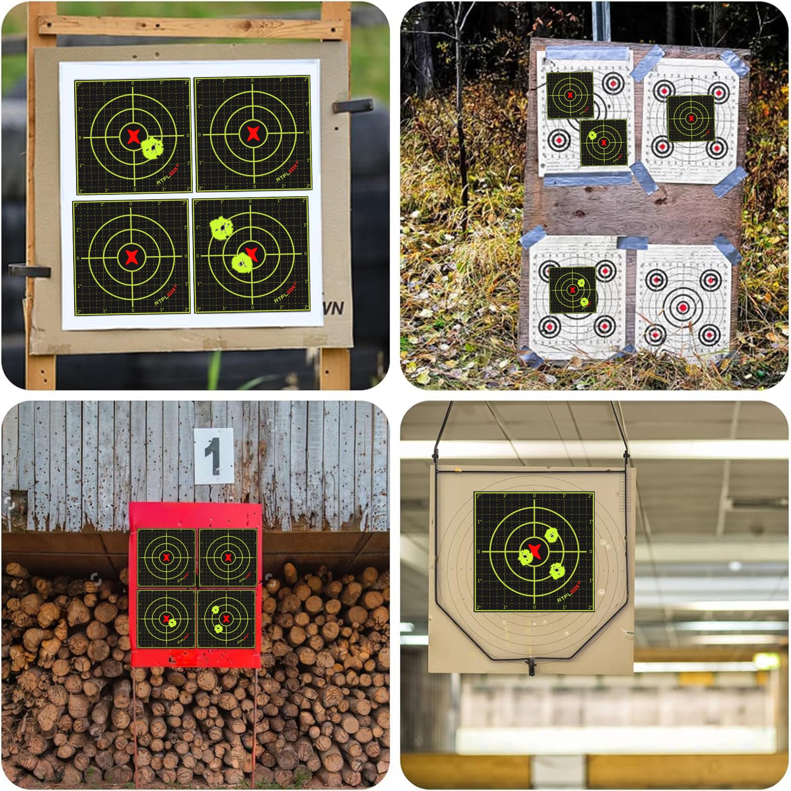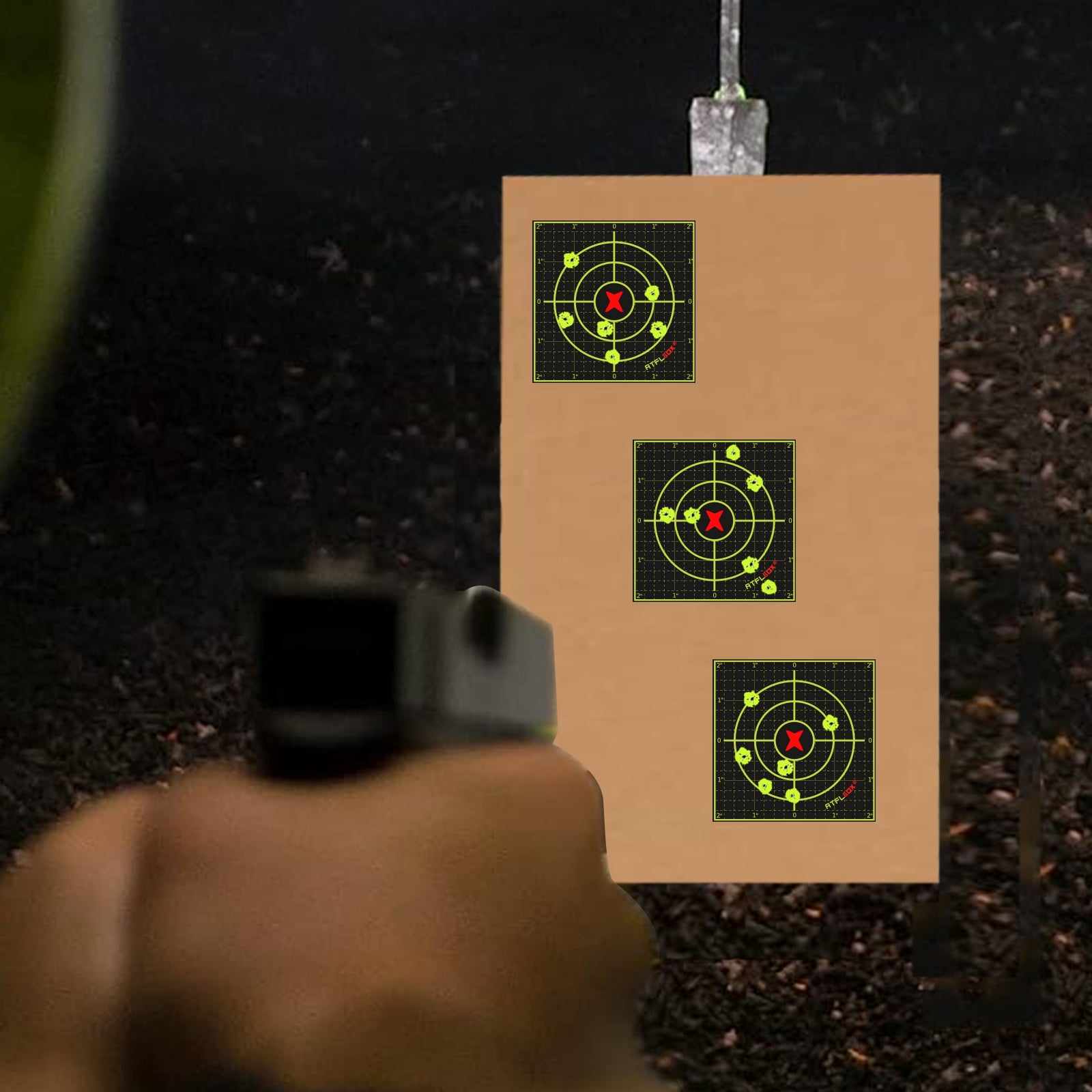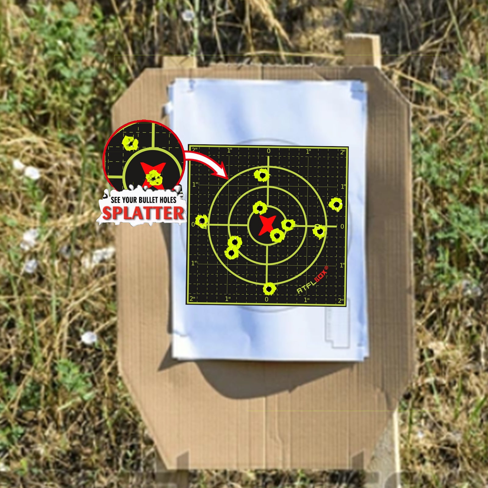 - Total 200 pieces of 4-inch splatter Sight in shooting target stickers, Instantly see your shot burst bright fluorescent yellow quickly locate the target paper, spend less time looking for the target, and more energy to shoot.